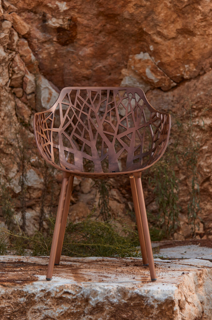 Fast’s Forest Limited Edition redefines what outdoor metal furniture can look and feel like. Introduced as part of its 30th-anniversary celebration, this restyled classic brings a richer, more atmospheric presence to one of the company’s most recognizable designs. The new metallic copper finish suggests a surface shaped by time: warm, irregular, and quietly luminous.