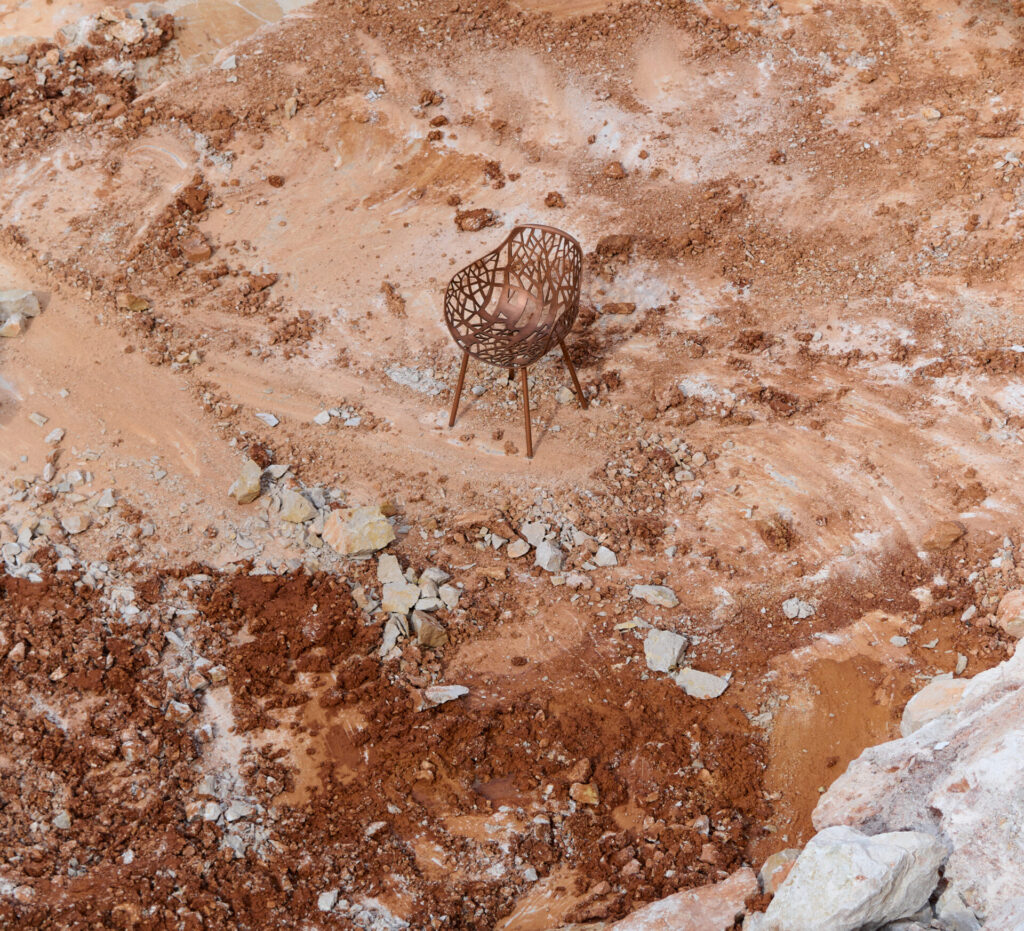 Originally designed by Robby Cantarutti & Partners, Forest has always explored how aluminum can feel airy rather than industrial. The branch-like cutouts remain its defining gesture, but this edition gives them new depth. The finish heightens each intersection and adds tonal nuance, echoing the brand’s recent chromatic experimentation in Fast Forward to the Color Revolution.