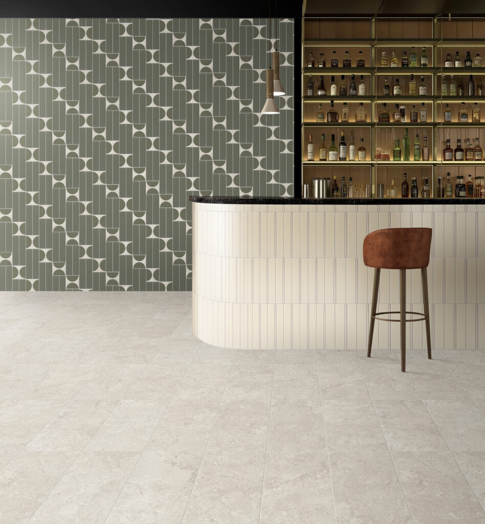 Designed for both wall and floor applications, the collection combines porcelain and ceramic formats through a clear architectural framework. Instead of decoration for its own sake, the surfaces use geometry to create rhythm and order. At the same time, limestone-inspired tones ground the collection visually. With rectified edges, matte and polished finishes, and a disciplined palette, the system scales easily from smaller zones to large public spaces.